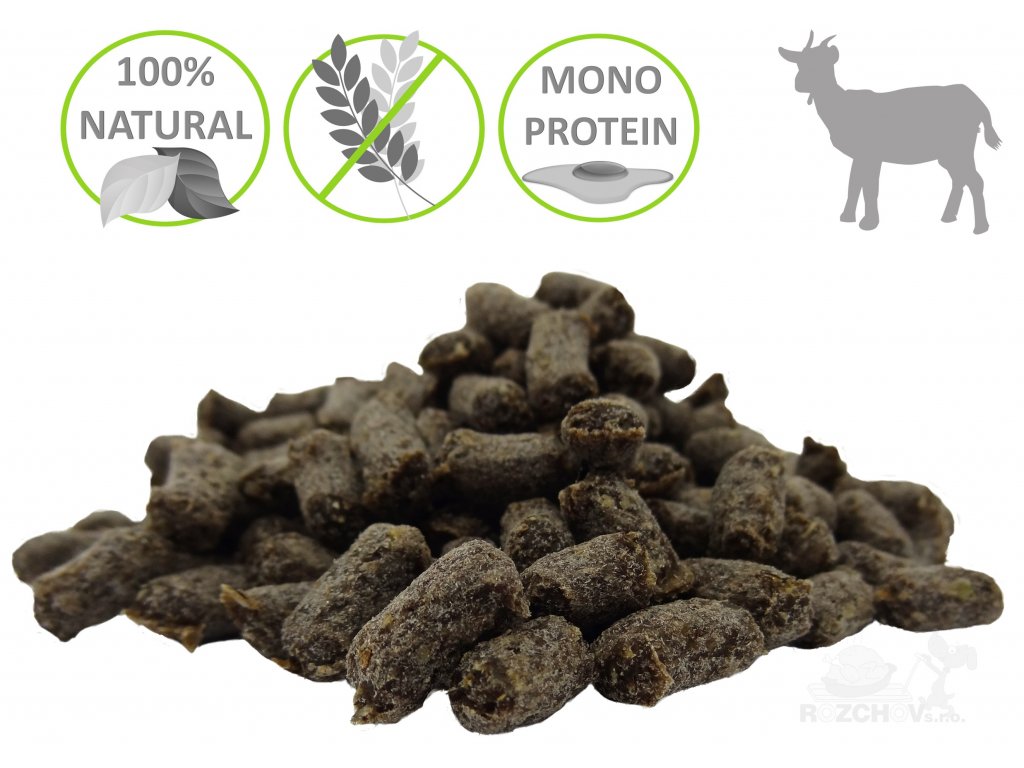Složení: Čerstvé kozí maso a droby 30%, konopné semeno (částečně odolejované), lněné semeno (částečně odolejované), semeno světlice barvířské (částečně odolejované), maniokový škrob.