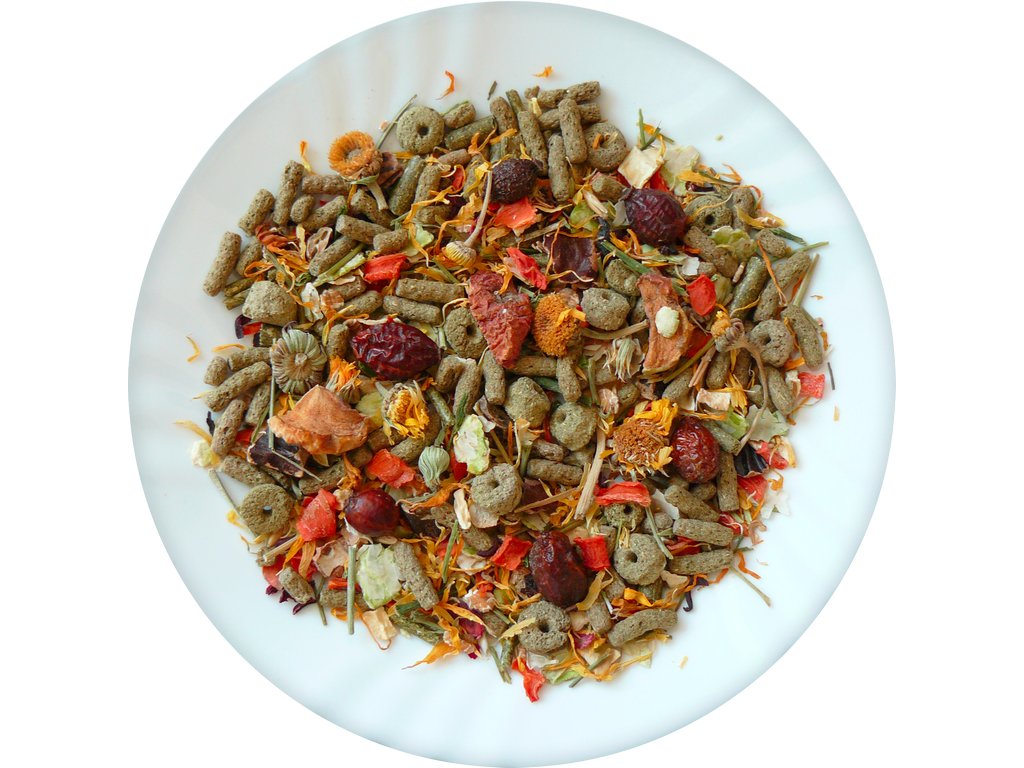 Kompletní prémiové krmivo se spoustou zeleniny, ovoce, oříšků a bylinek.