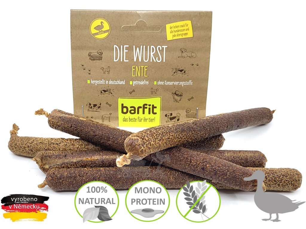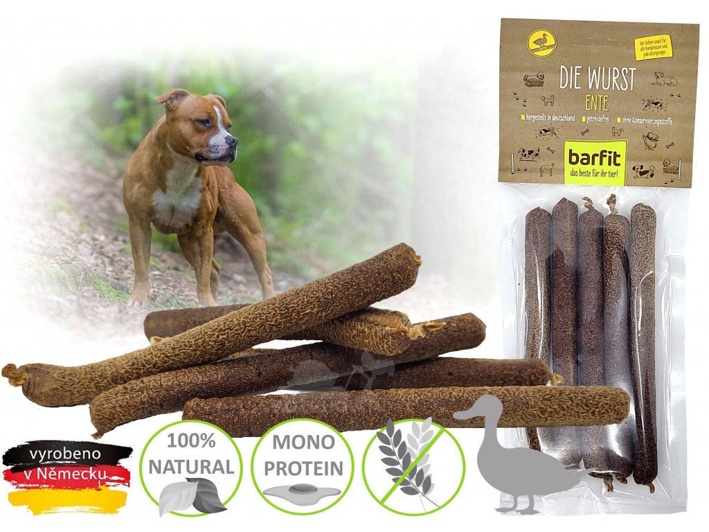 Barfit klobásky s kachním masem jsou voňavý a chutný pamlsek pro psy v každém věku. Čistě přírodní produkt.
