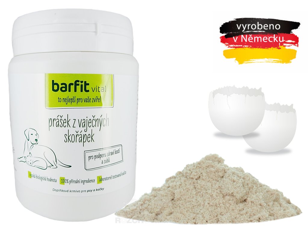 Prášek z vaječných skořápek Barfit vital Vhodné pro psy na dietě bez kostí, psy trpící onemocněním ledvin i psí seniory. Jemně namletý prášek ze skořápek zaručuje vyšší vstřebatelnost. Jedná se o přírodní doplněk vhodný pro psy i kočky. Především se doporučuje pro psy krmeny syrovou stravou tzv. B.A.R.F. Jemně namletý prášek ze skořápek zaručuje vyšší vstřebatelnost.
