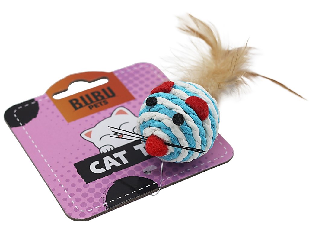 BUBU PETS hračka pro kočky, kulatá myš z přírodního lana s peřím