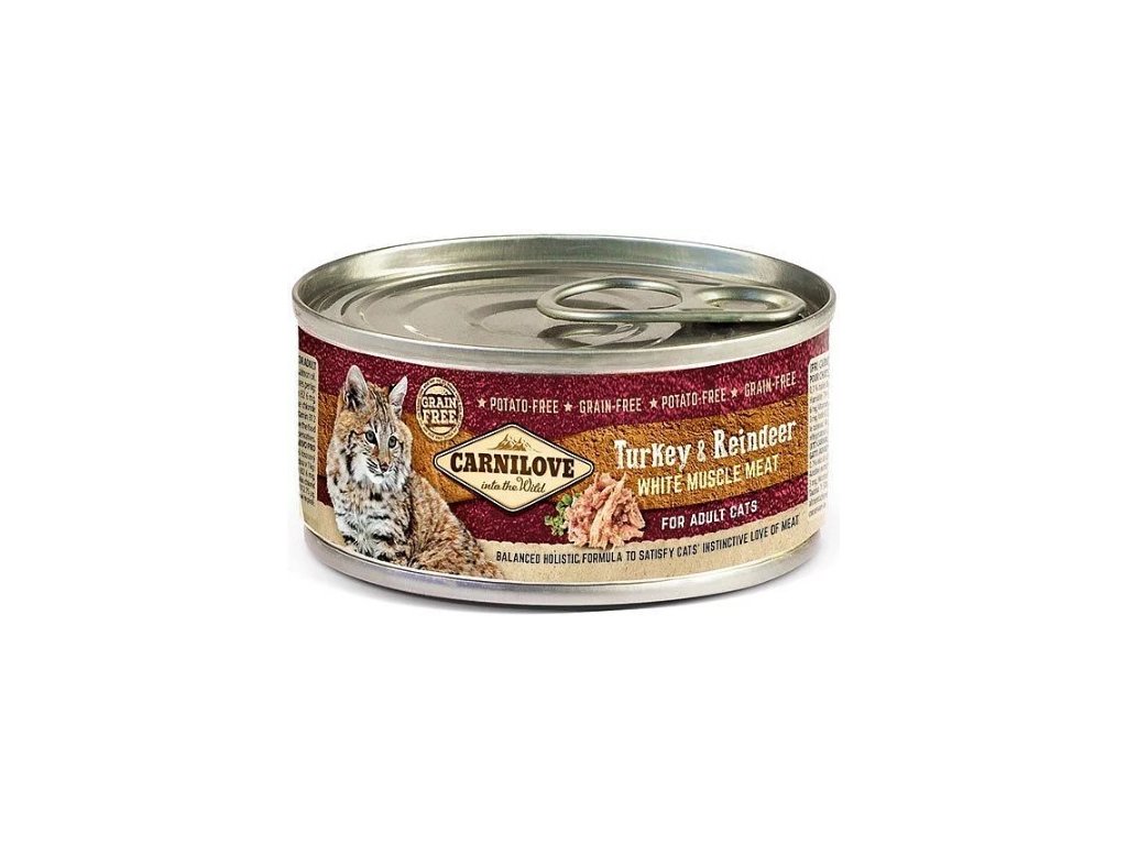 Konzerva pro kočky s bílým krocaním masem ze svaloviny a chutným sobím masíčkem.