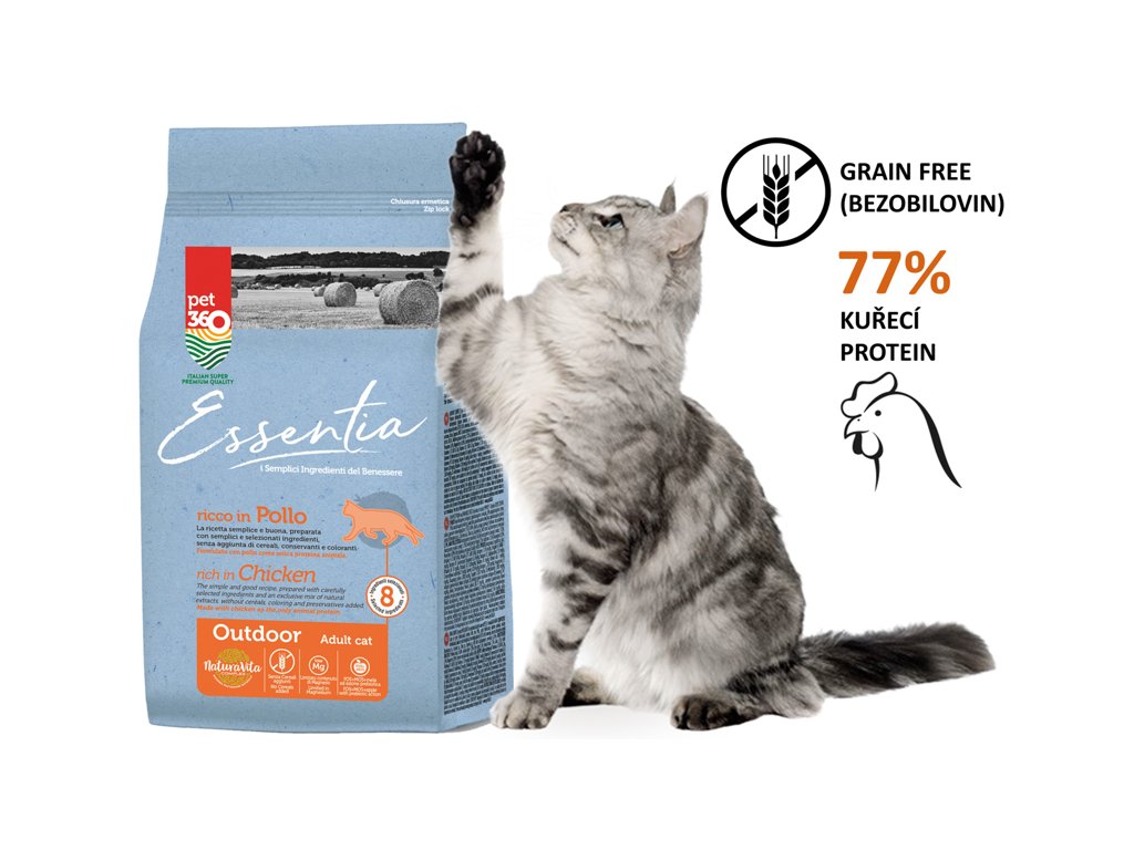 Super prémiové grain free (bezobilovin) granule Essentia Outdoor jsou vhodné především pro kočky které tráví většinu času mimo domov. Poskytují těm aktivnějším kočkám spousty energie díky vysokému obsahu živočišných bílkovin (77%kuřecí protein) a chrání je před infekcemi a parazity.