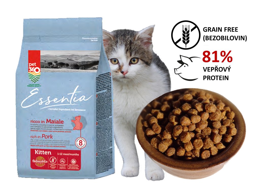 Super prémiové grain free (bezobilovin) granule specifické pro koťata a rostoucí kočky - podporují imunitní systém Vysoký obsah vepřového masa (živočišný protein 81%) Vepřové maso jako hlavní zdroj živočišných bílkovin.