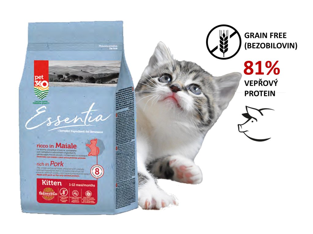 Super prémiové grain free (bezobilovin) granule specifické pro koťata a rostoucí kočky - podporují imunitní systém Vysoký obsah vepřového masa (živočišný protein 81%) Vepřové maso jako hlavní zdroj živočišných bílkovin.