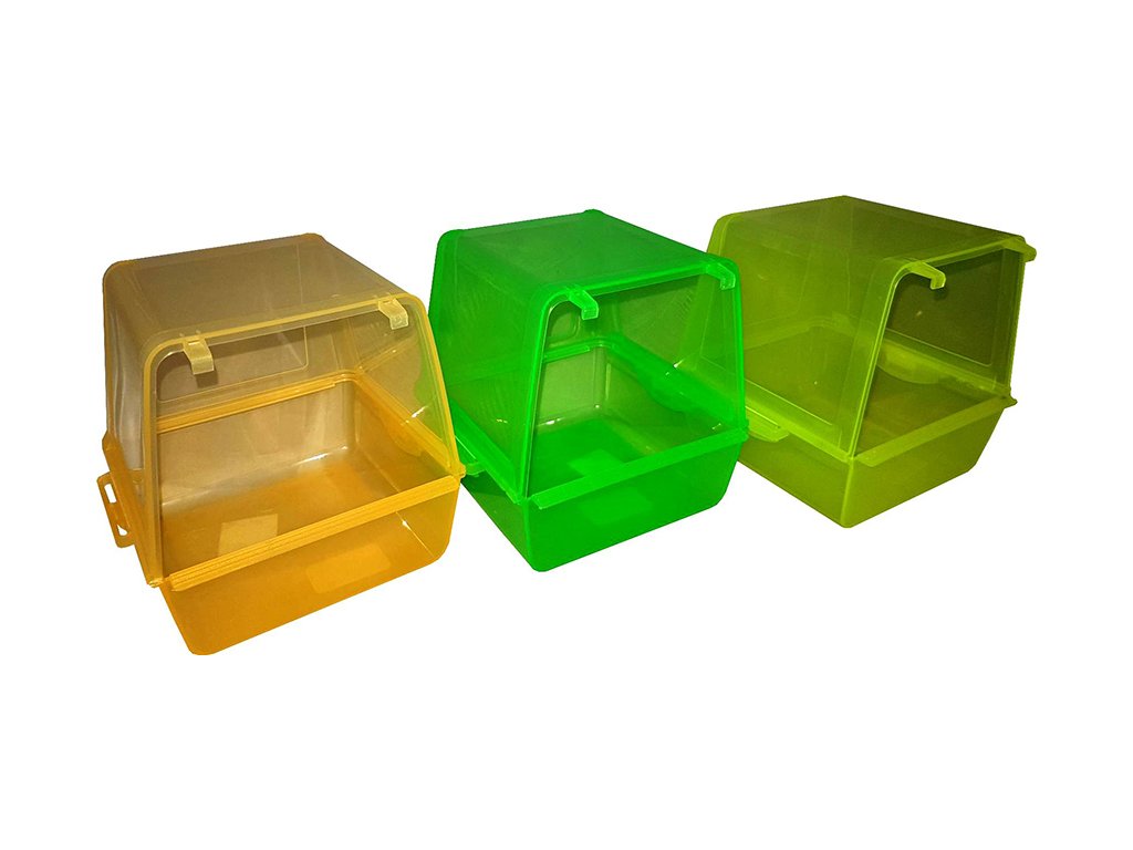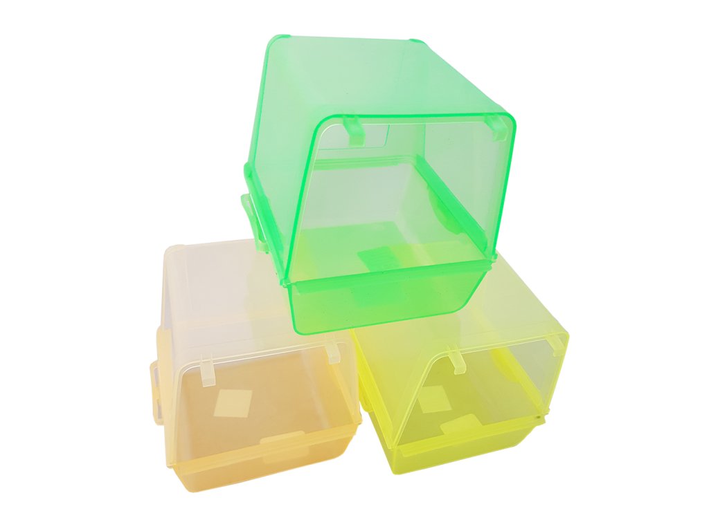 Osvědčená plastová koupelna pro exoty a malé papoušky. Šířka 11.6 cm, výška 11cm, hloubka 11 cm.