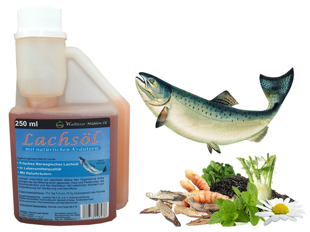 Lososový olej je skvělý doplněk stravy pro vašeho psa, který přispívá ke zdravé struktuře kůže a srsti, dobré struktuře kostí a vitální střevní flóře. Složení je lososový olej 99,5 %; 0,5 % bylinná směs: listy máty peprné, plod kmínu, pískavice řecké seno, kořen lékořice, kořen kurkumy, semena fenyklu, květy heřmánku.