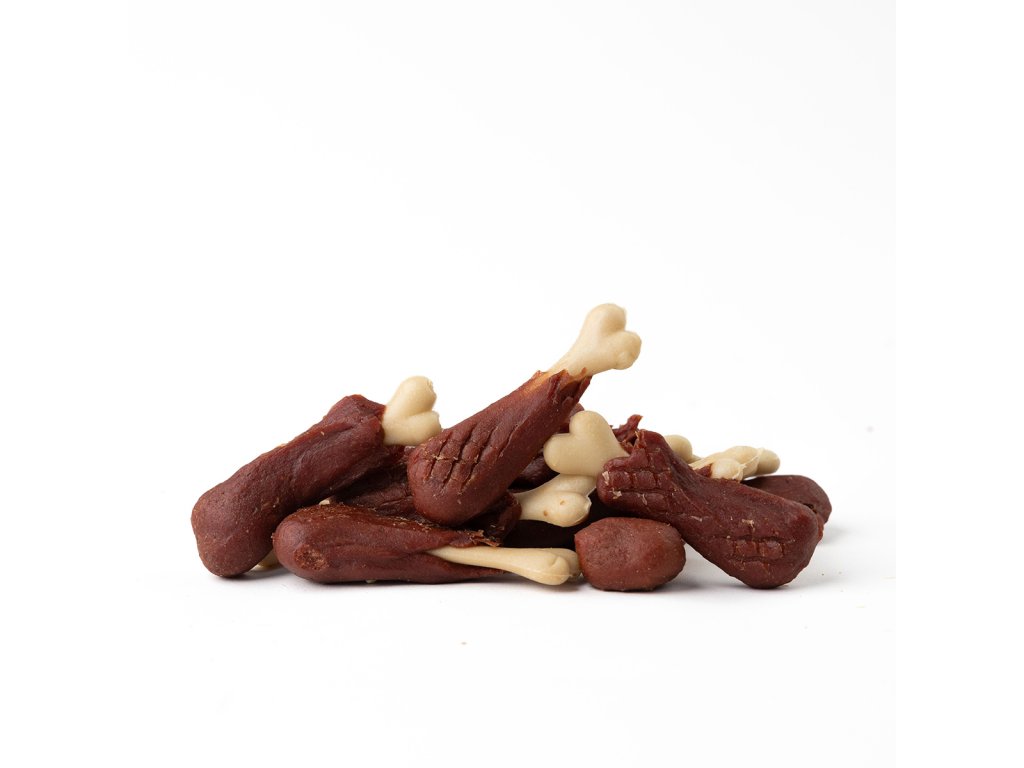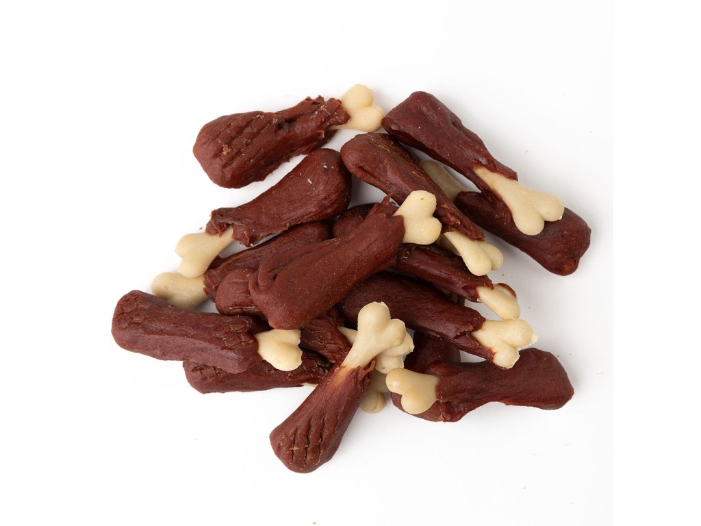 Přírodní masová pochoutka z kachního masa na křupavé kalciové kostičce ve tvaru stehna.