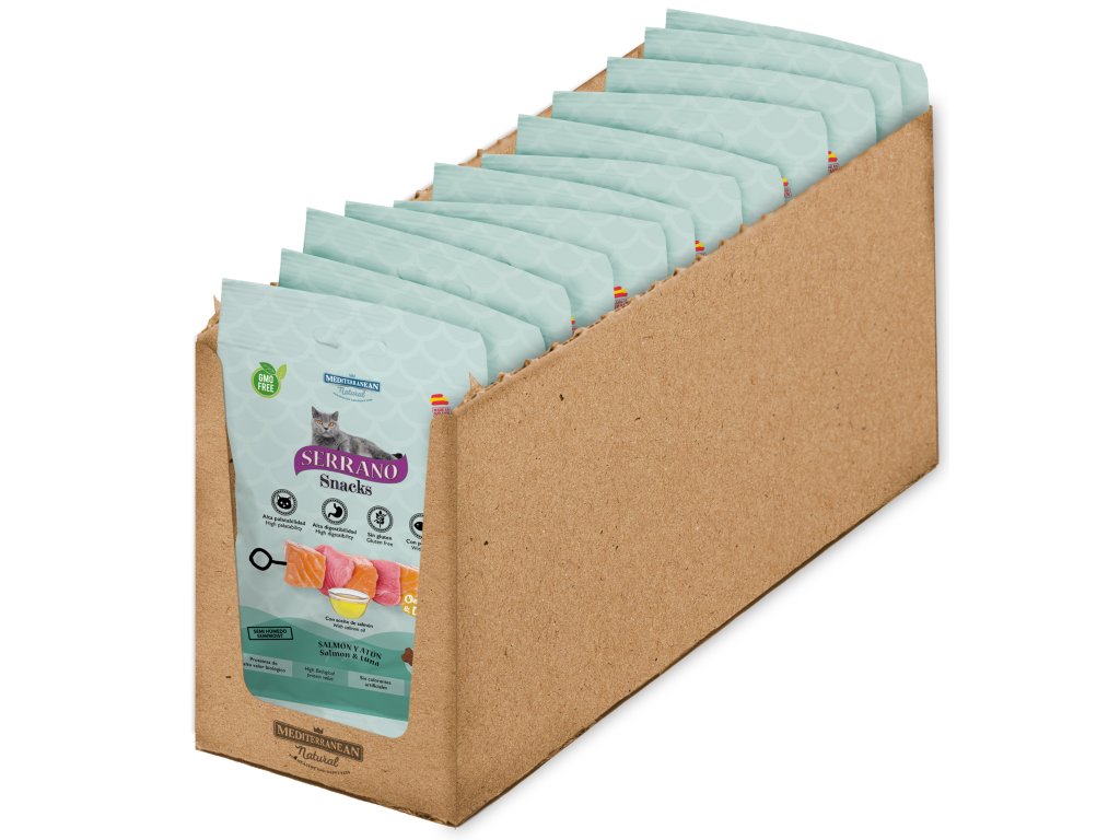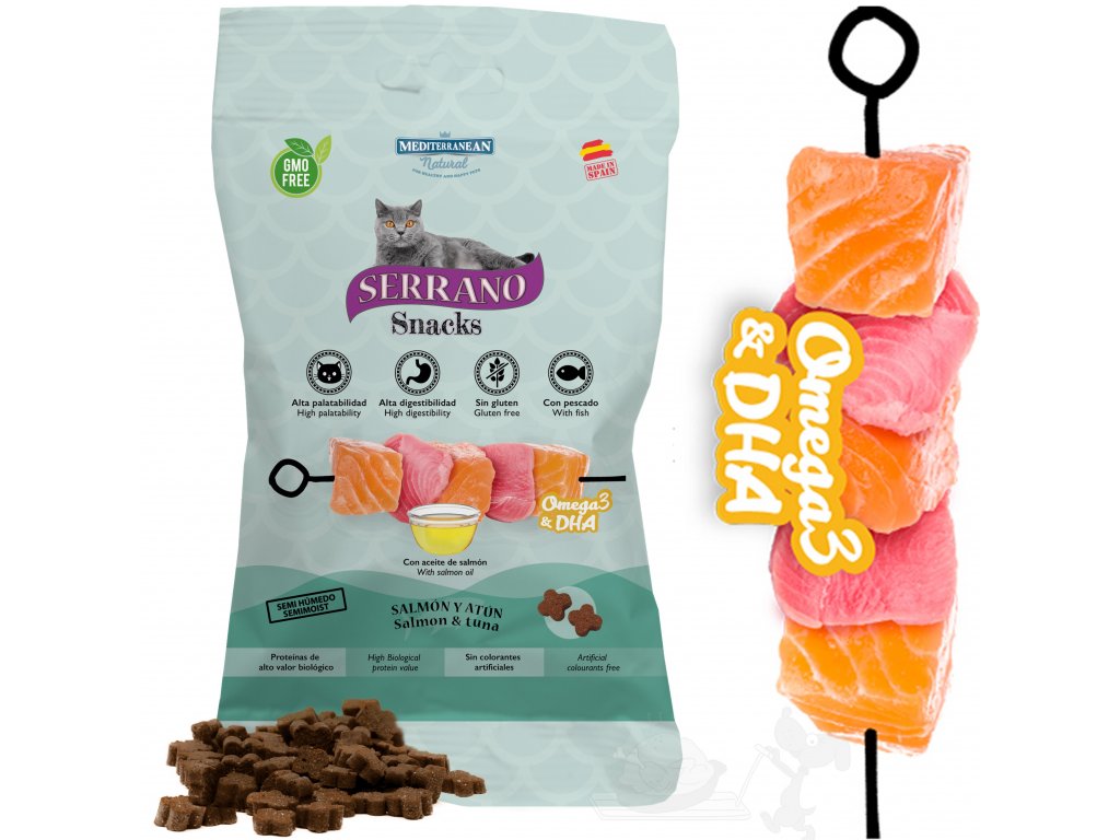 Přírodní pamlsek Serrano Snacks pro kočky – Omega 3 + DHA (Losos a Tuňák). Tyto lahodné svačiny, obsahující lososa a tuňáka, jsou obohaceny o Omega 3 a DHA, což podporuje celkové zdraví vaší kočky.