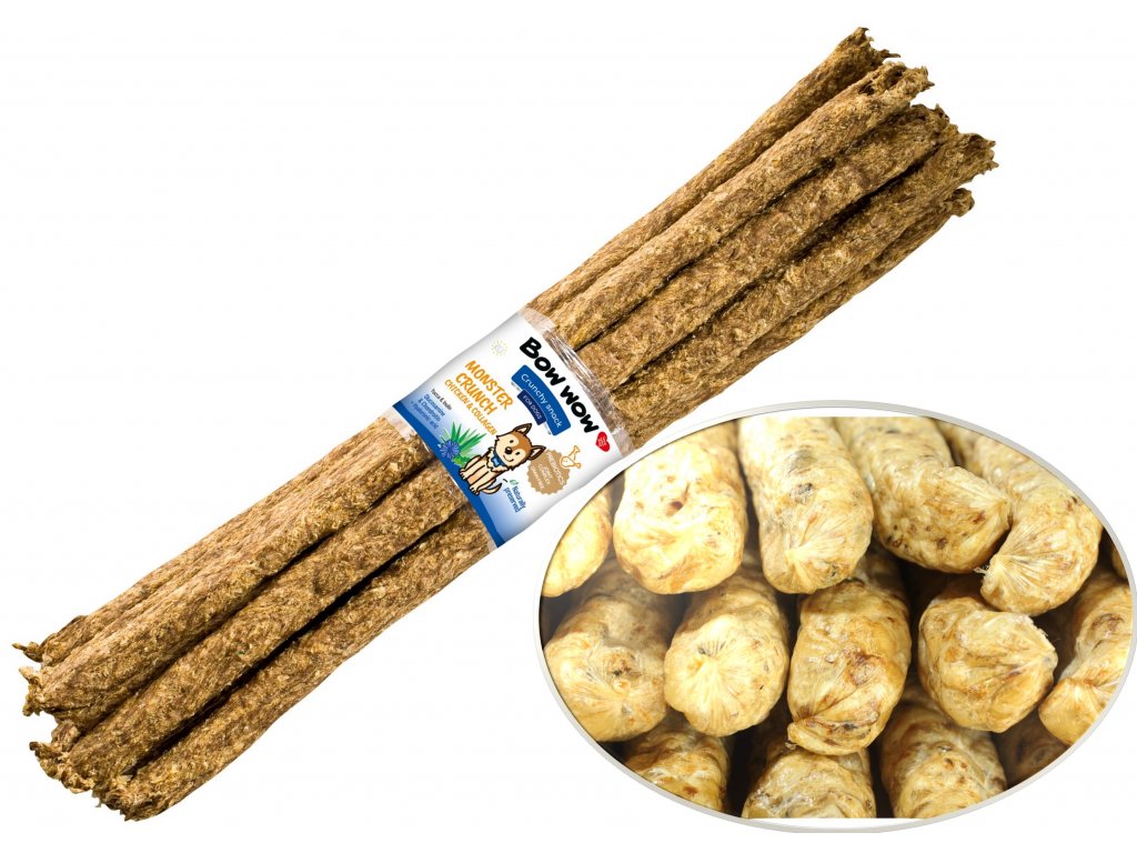 Pochoutka a pamlsek pro psy, hrubá tyč s kolagenem výborně ochucená hovězími a vepřovými škvarky. Dá se snadno lámat na tak velké díly, které chceme v daný moment psovi podávat. Baleno ve svazku po 12ks.