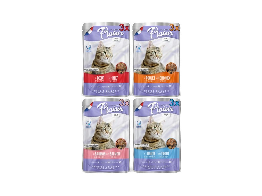 3x Plaisir hovězím a krůtím masem 100g - Kapsička Plaisir Adult pro dospělé kočky.