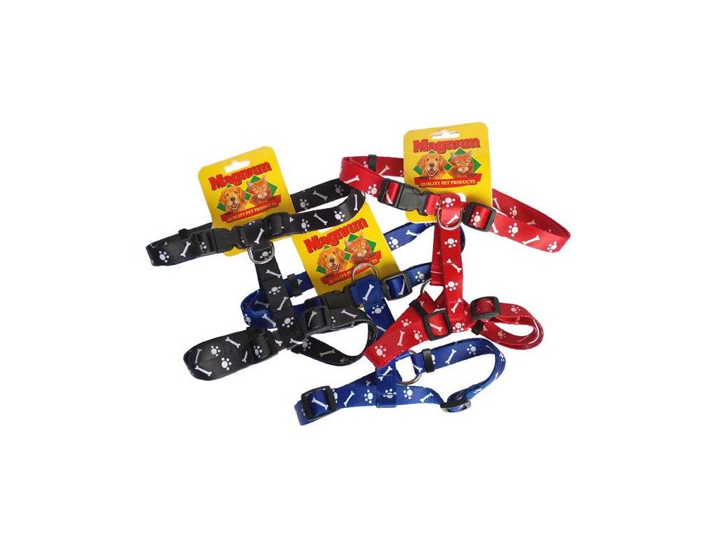 Elegantní postroj z hladkého nylonového popruhu se vzorem tlapek nebo kostiček. Nastavitelný po obvodu hrudníku i krku psa.