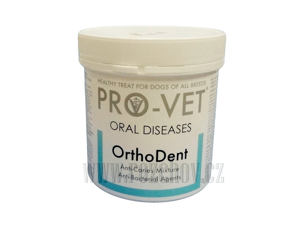 Zdravé složky PRO-VET OrthoDent obsahují Anti- Caries Mix. Anti-Caries Mix se skládá z různých koření, které snižují proliferaci ústních bakterií a snižují tvorby zubního plaku a zubního kamene. Přispívá k zlepšování špatného dechu a specifické inhibici bakteriální produkce sulfonovaných těkavých mastných kyselin.