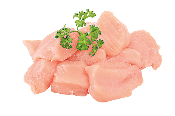 kuřecí maso a orgány 65 %, hrachová mouka 2 %, lignocelulóza 0,7 %.