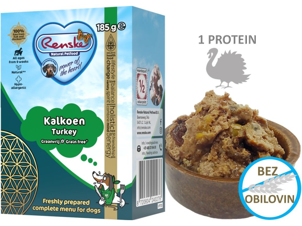 Renske Tetra pak obsahuje 55 % čerstvé krůty doplněné lahodnou zeleninou. Díky kvalitním surovinám jsou jídla lehce stravitelná a oblíbená i mezi náročnými jedlíky! Jídlo je baleno do pohodlných balíčků s malými porcemi, které se skvěle hodí i na cesty nebo dovolené. Kompletní, bezlepkové a bezobilné vlhké krmivo pro mladé, dospělé i staré psy všech plemen od 9 týdnů věku.
