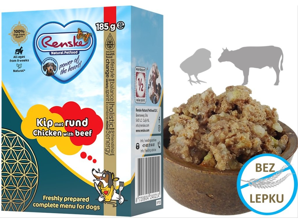 Renske s čerstvým kuřecím a hovězím masem je kompletní krmivo pro mladé, dospělé i staré psy všech plemen od 9 týdnů věku.