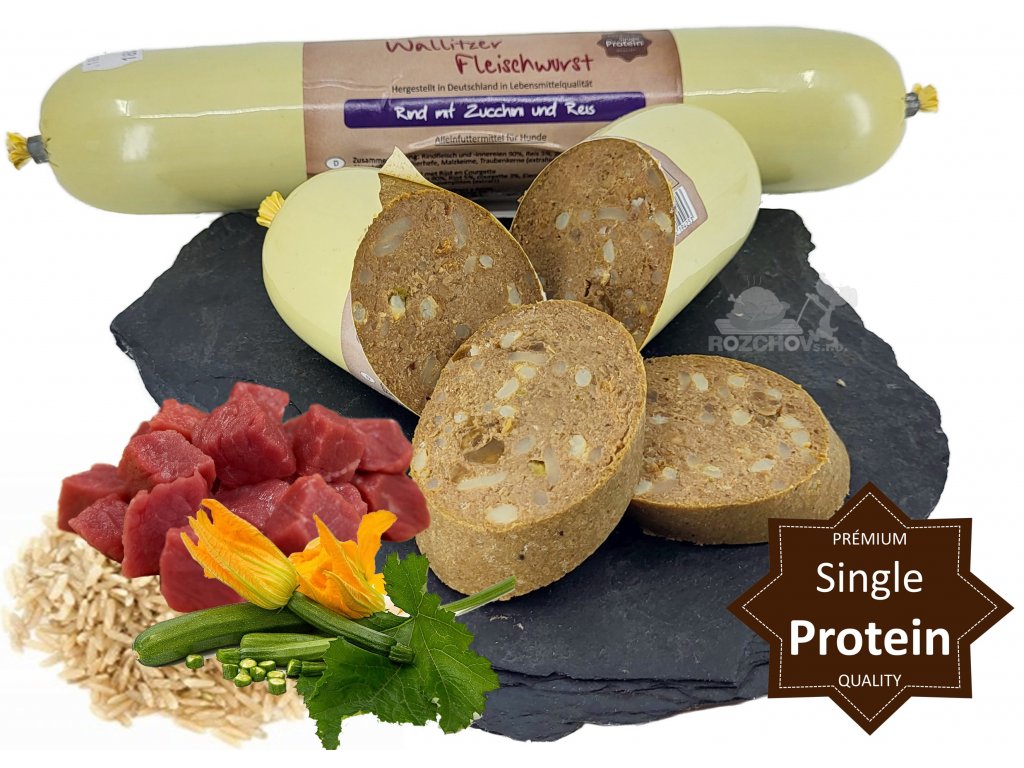 Wallitzer salám pro psy - hovězí s cuketou je vyroben z čerstvého masa a čerstvých ingerdiencí. Není napuštěno vodou, kupujete čistý protein. Jedná se o kvalitní německý výrobek! Obsahují pouze jeden druh masa, tím jsou vhodné i pro alergické pejsky. Lehce stravitelný vhodný i na cesty.