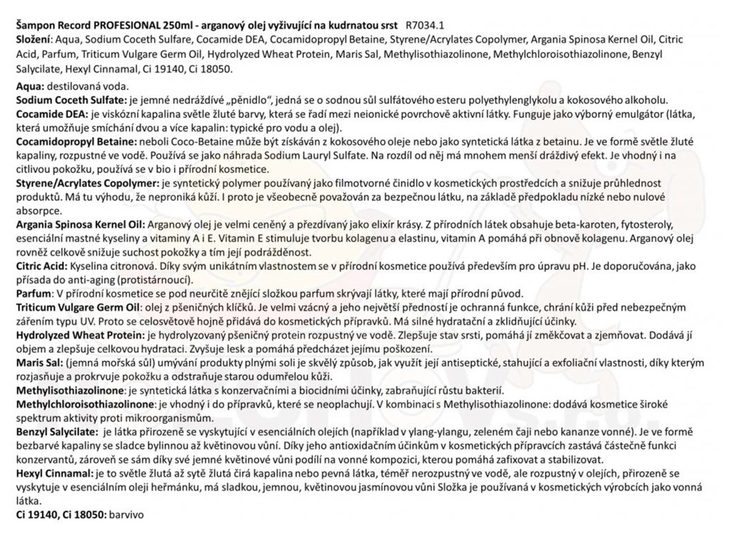 Posilující šampon Record PROFESIONAL 250ml s arganovým olejem. Doporučujeme pro pudly a pro další plemena s kudrnatou srstí. Arganový olej je jedním z nejvzácnějších a nejdražších vůbec, dopřejte svému pejskovi při koupeli trochu luxusu. Šampón pro psy vyvinutý také pro profesionály, neobsahuje parabeny, silikon ani žádné ropné látky. Může vykazovat vynikající regenerační účinky a napomáhá stabilizovat vlhkost v pokožce. Je vhodný pro jakýkoliv typ pokožky, zejména pak suchou a citlivou. Každý šampon nebo kondicionér RECORD má jinou specifickou, velmi jemnou podmanivou vůni.