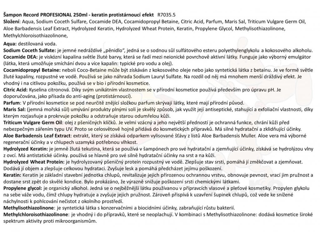 Šampon Record PROFESIONAL s keratinem - Keratin je základní prvek ve struktuře chlupů a pokožky. Zabraňuje vysychání a chrání před vnějšími vlivy. Hydrolyzovaný keratin má hydratační, zjemňující a vyhlazující účinky. Hydrolyzovaný keratin se přidává do šampónů také pro snížení statické elektřiny.