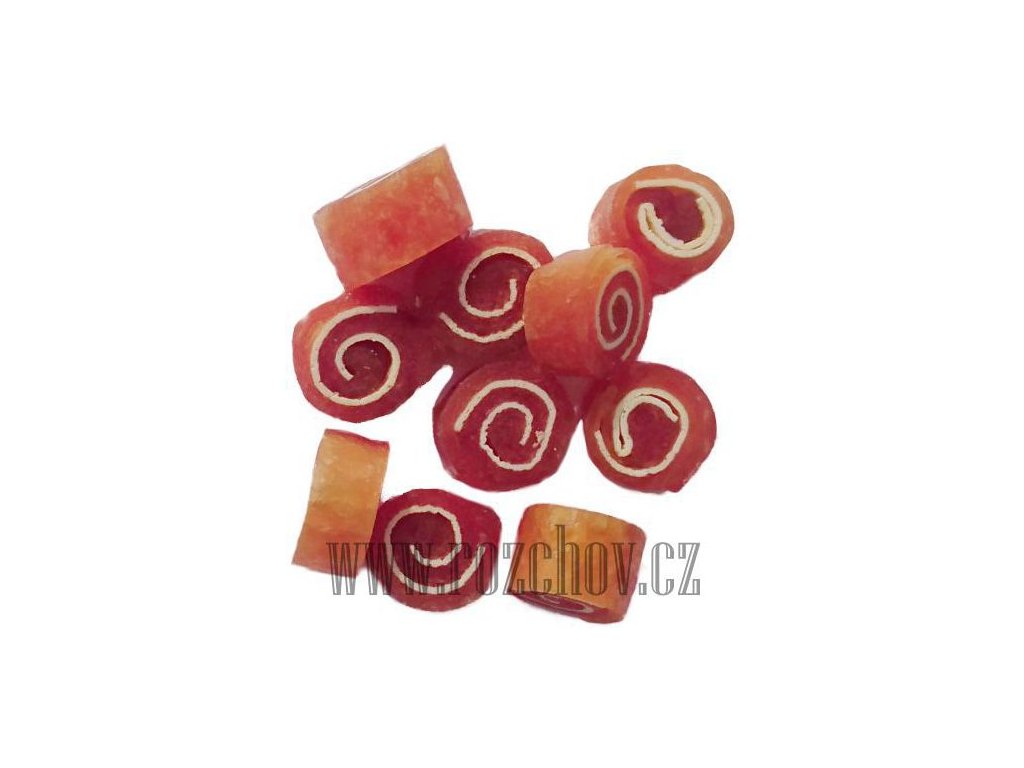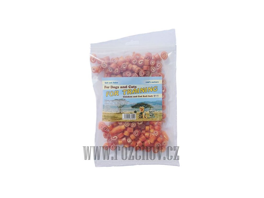 Mini roláda kuře s treskou 230g. Masový pamlsek vyroben především z kuřecího masa a tresky. Vhodný nejen pro menší psy ale i pro kočky. Kolečko o průměru 1cm a výšce cca 0,5cm, je pevné měkké konzistence.