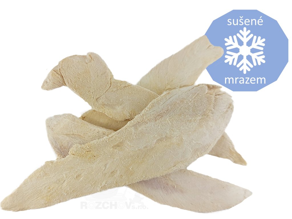 Kachní prsa sušená mrazem si díky unikátnímu procesu zpracování zachovávají vysokou chutnost a výživovou hodnotu. Tato metoda zpracování zachovává kvalitu masa (odpovídající syrové stravě), vysoký obsah bílkovin, výrazná chuť i vůně a zachované nutriční hodnoty. Pamlsky jsou zcela bez glycerinu, konzervantů, barviv, ochucovadel. 100% čisté maso! Kachní plátky mají cca 10-13cm.
