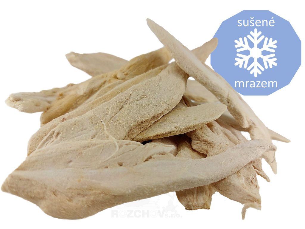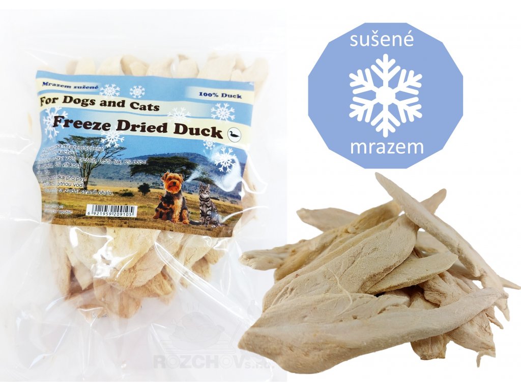 Mrazem sušené kachní prsa jsou velmi praktické na cesty. Nepotřebují skladování v lednici a velmi dobře se podávají, protože jsou křehké. Mají kvalitu syrového masa, ale můžete je vzít kamkoliv. Na rozdíl od vjetšiny nabízených sušených masíček neosahují Glycerin. (Glycerol neboli glycerin je slabě jedovatý. V menších dávkách způsobuje bolesti hlavy, žaludeční potíže a zvracení. Ve větších dávkách může způsobit poškození jater.)