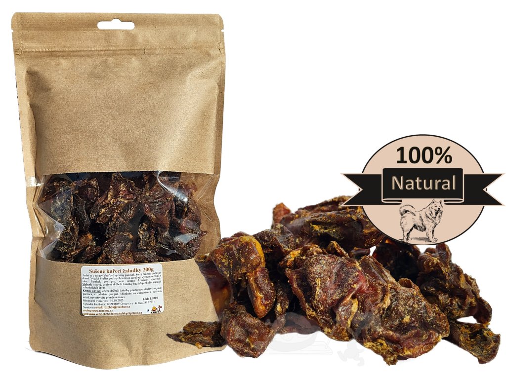 Sušené kuřecí žaludky jsou oblíbeným přírodním pamlskem pro psy. Jsou vyrobeny z čerstvých kuřecích žaludků, které jsou následně sušeny. Tento proces zachovává většinu přírodních živin a vytváří tvrdou, žvýkací pochoutku, která zabaví vašeho psa na dlouhou dobu.