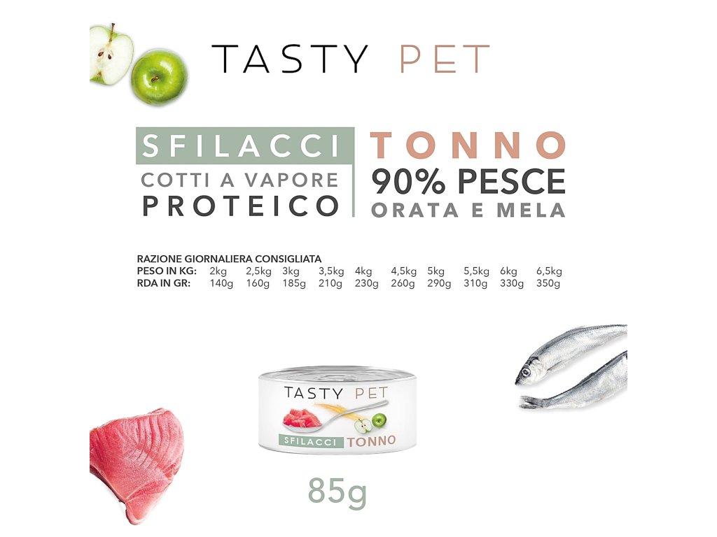 Jemné trhané maso tuňáka, pražmy a jablka (85 g) Dopřejte své kočce skutečný kulinářský zážitek z mořských hlubin. Kompletní mokré krmivo pro kočky TASTY.PET přináší unikátní recepturu plnou šťavnatých rybích "shreds" (trhaných kousků), které si vaše kočka zamiluje od prvního sousta.