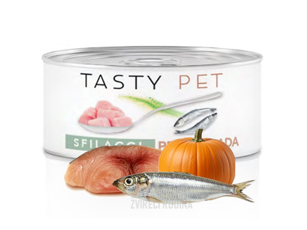 TASTY PET premium mečouna, ančovičky a dýně ve vývaru 85g