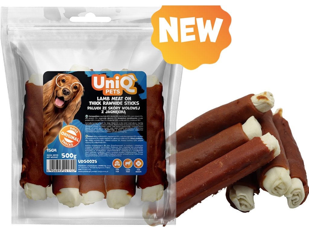 UNIQ PETS Bůvolí tyče obalené jehněčím masem 500g 15 cm 6ks