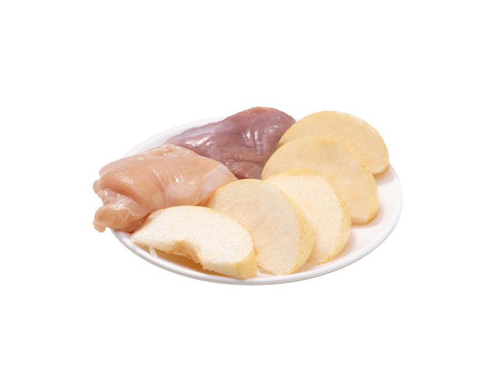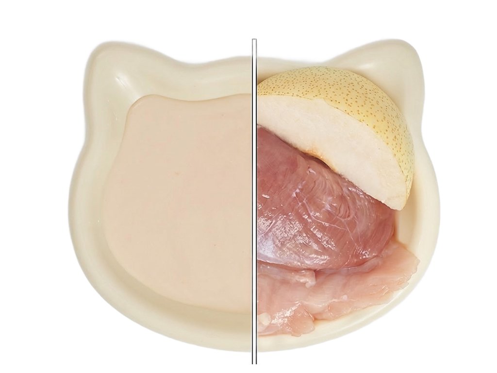Receptura kombinuje kachní prsa (22 %), kuřecí prsa (20 %) a hrušku (3 %). Díky vysokému podílu vývaru je krmivo příjemně šťavnaté a přispívá k lepšímu příjmu tekutin, což je u koček velmi důležité. Kočky přirozeně pijí málo, proto je vhodné zařazovat do jejich jídelníčku i krmivo s vyšším obsahem tekutin. Díky vysokému obsahu vývaru a jemné krémové textuře je tento pamlsek chutným způsobem, jak kočce dopřát více tekutin během dne.