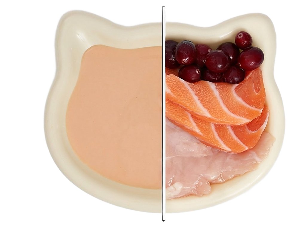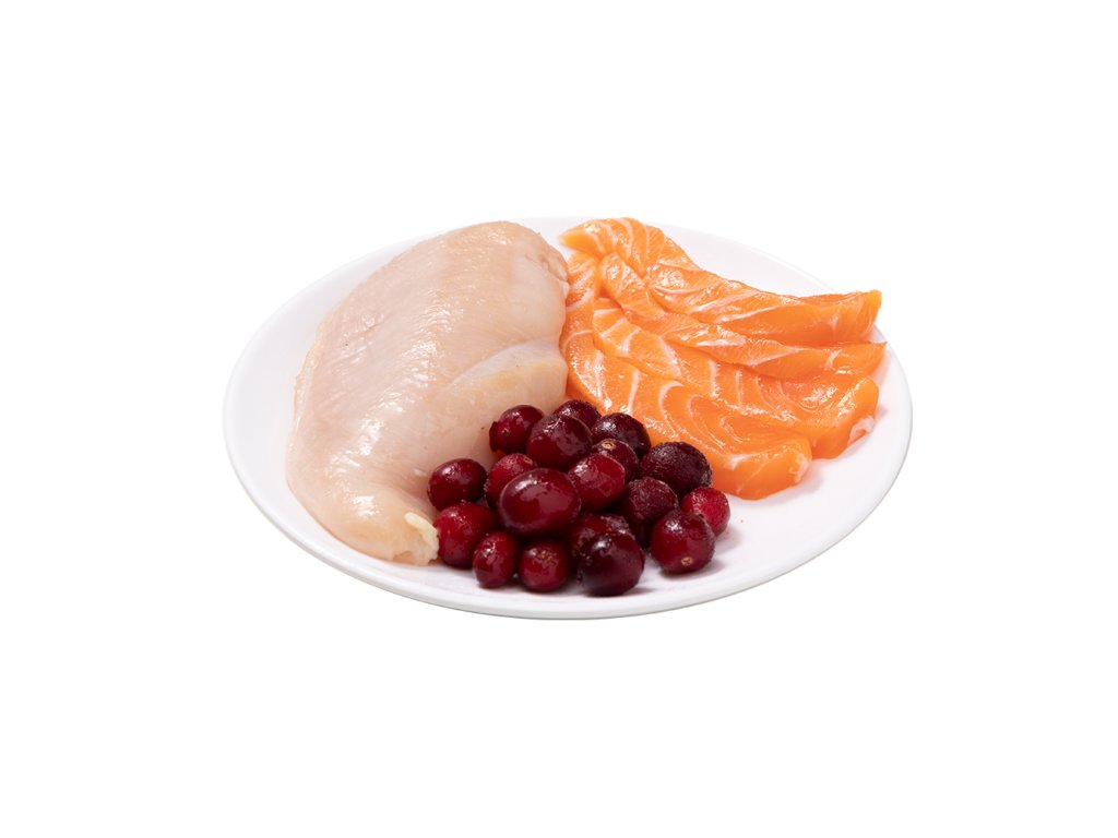 Receptura kombinuje lososa (22 %), čerstvá kuřecí prsa (20 %) a brusinky (3 %). Díky vysokému podílu vývaru je krmivo příjemně šťavnaté a přispívá k lepšímu příjmu tekutin, což je u koček velmi důležité. Brusinky jsou přirozeným zdrojem antioxidantů a bývají vyhledávané pro podporu celkové vitality a péče o močové cesty. Recepturu doplňuje také taurin, který je pro kočky důležitou součástí výživy.