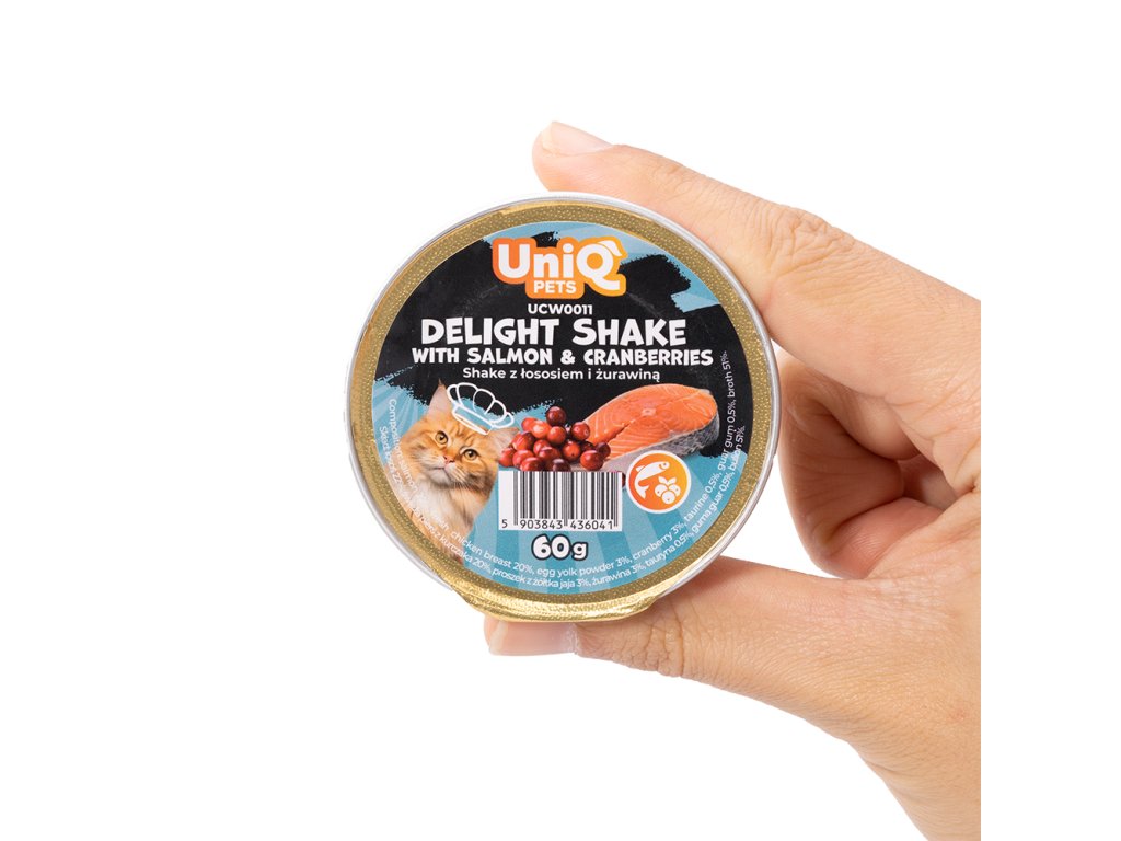 UNIQ PETS CAT WET FOOD DELIGHT SHAKE je vhodný jako chutné doplňkové mokré krmivo nebo jemná odměna pro kočky všech věkových kategorií od 2 měsíců věku. Oceníte také praktické balení 60 g, které pomáhá zachovat čerstvost a usnadňuje dávkování.