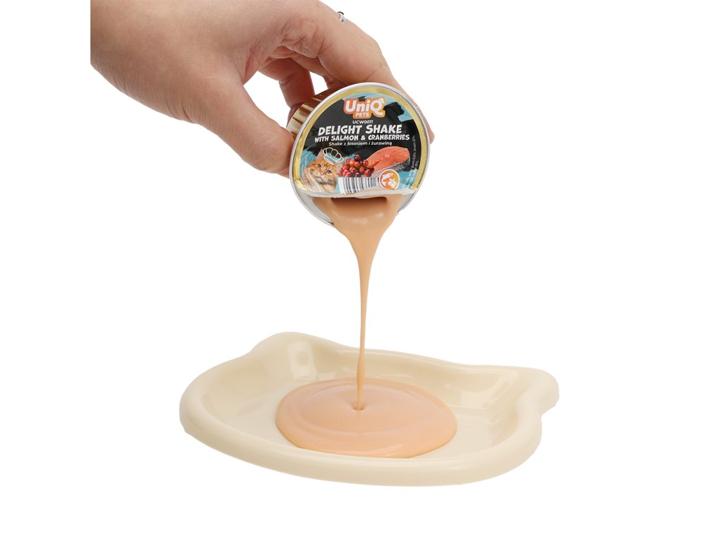UNIQ PETS Delight Shake losos a brusinky je jemný krémový pamlsek pro kočky s vysokým obsahem vývaru, lososem, kuřecím masem a brusinkami. Lahodná tekutější konzistence se snadno olizuje, pomáhá s příjmem tekutin a je vhodná pro koťata od 2 měsíců, dospělé i starší kočky.