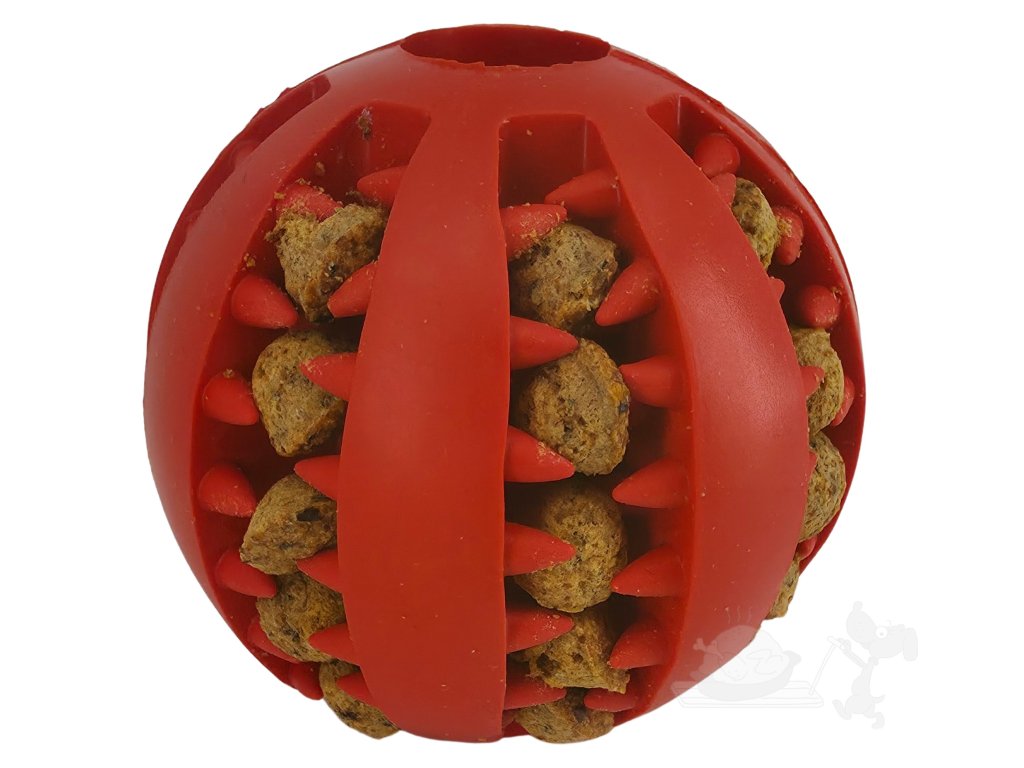 Gumový dentální míček s mátou a prostorem na pamlsky – červený 7cm. Větší míček, větší zábava... a neodolatelně svěží dech! 🐾