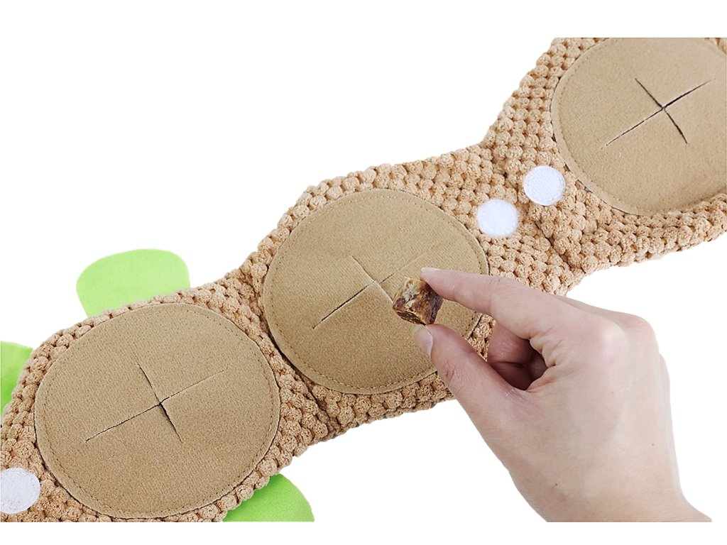 - 3 otvory na pamlsky: Na břiše želvy se nacházejí 3 větší otvory, do kterých můžete schovat oblíbené pamlsky vašeho pejska. Hledání pamlsků je pro psy skvělá zábava a zároveň trénink čichu.