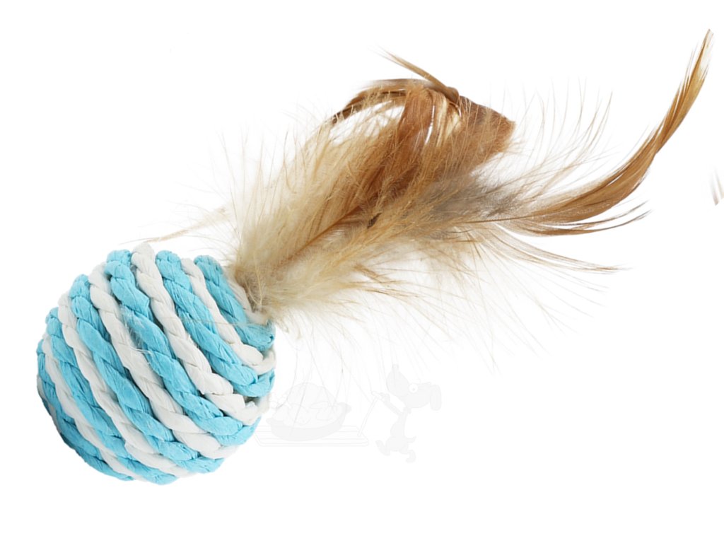 Příjemně chrastící kočičí míček z přírodního lana s peřím, dopřeje radost každému lovci!