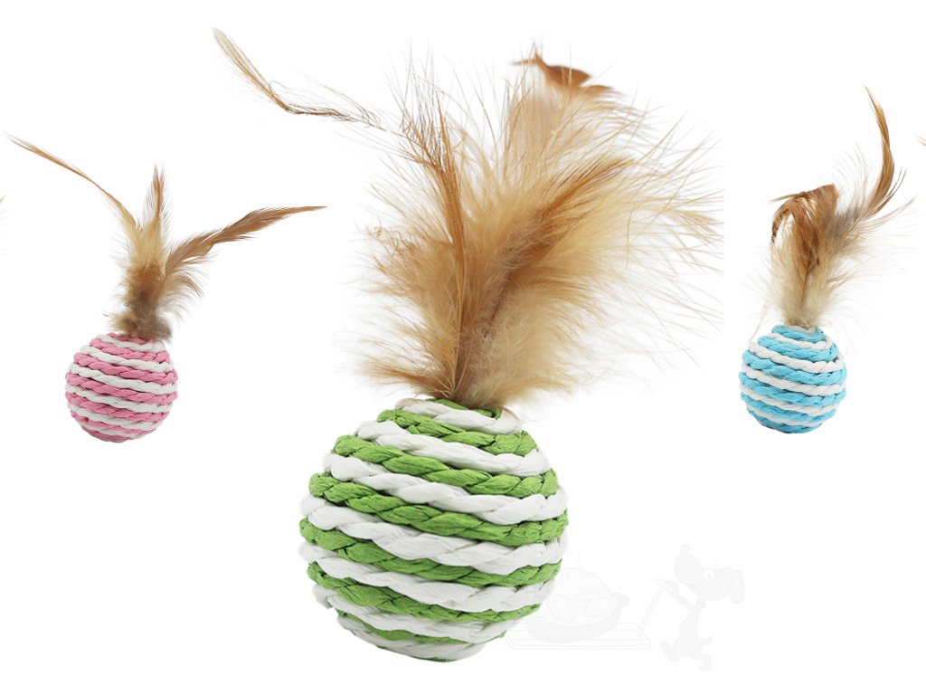 Chrastící sisalový míček s peřím je hračkou, jenž napomáhá péči o kočičí drápky. Barevnou variantu dodáváme dle současného stavu skladových zásob. Růžový, zelený , modrý - pokud preferujete nějakou barvu, uveďte prosím ji do poznámek.