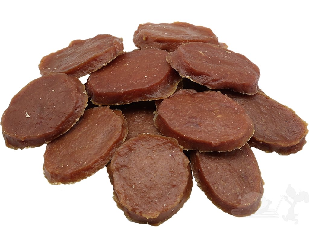 Pamlsek pro psy. Jehněčí masová kolečka. Poloměkká přírodní pochoutka pro psy a kočky.