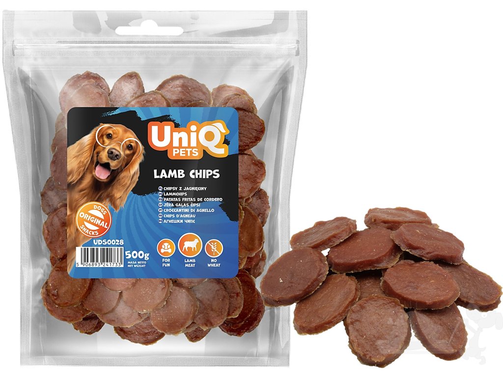 Uniq Pets Jehněčí chipsy 500g - Chutná odměna pro psy. Vyrobeno z jehněčího masa a dalších přírodních ingrediencí.