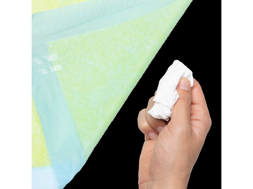 Vrchní vrstva z měkké netkané textilie je šetrná k tlapkám a pomáhá rychlému vsakování tekutin. Vnitřní jádro z nadýchané dřevní buničiny s vysokou hustotou rychle absorbuje vlhkost a pomáhá omezit zápach. Spodní voděodolná PE vrstva chrání podlahu, dlažbu, koberec i dno klece nebo přepravky.