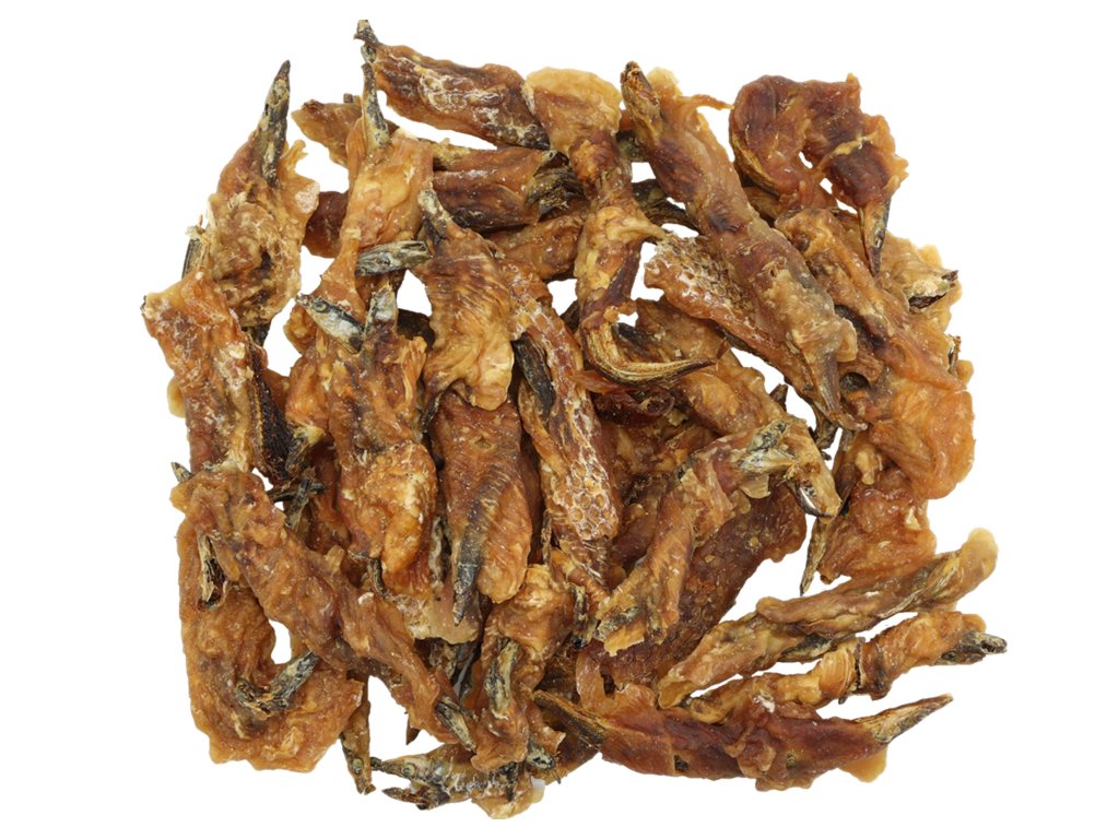 Rybičky obalené kuřetem potěší každého pejska. Sušené rybky omotané proužkem kuřecího masa.