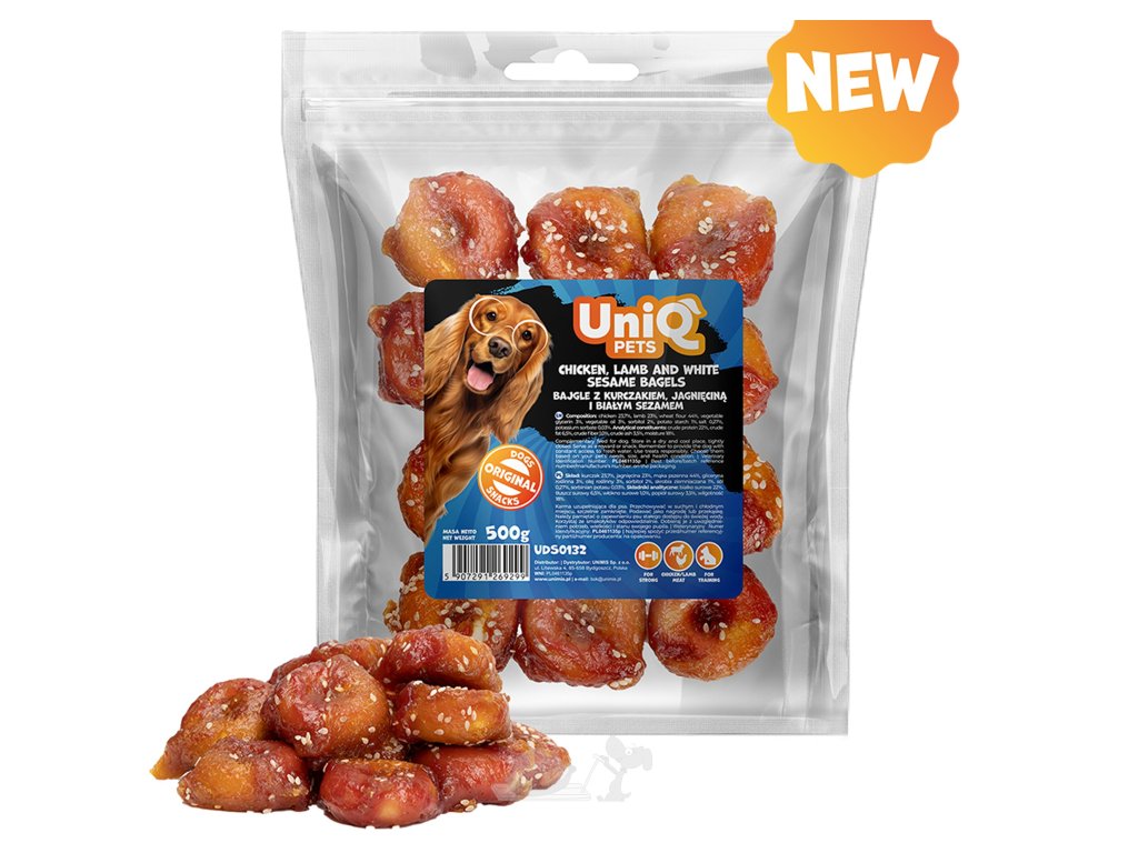 UNIQ PETS PSÍ SNACKS CHEWY 500g - Věnečky s kuřecím, jehněčím a bílým sezamem (4 cm) Rozmazlujte svého psa chutnými věnečky s kombinací kuřecího a jehněčího masa, dozdobenými křupavým bílým sezamem. Tyto 4cm kroužky jsou navrženy pro dlouhotrvající žvýkací zábavu, která vašeho psa zabaví a uspokojí jeho přirozené žvýkací instinkty.