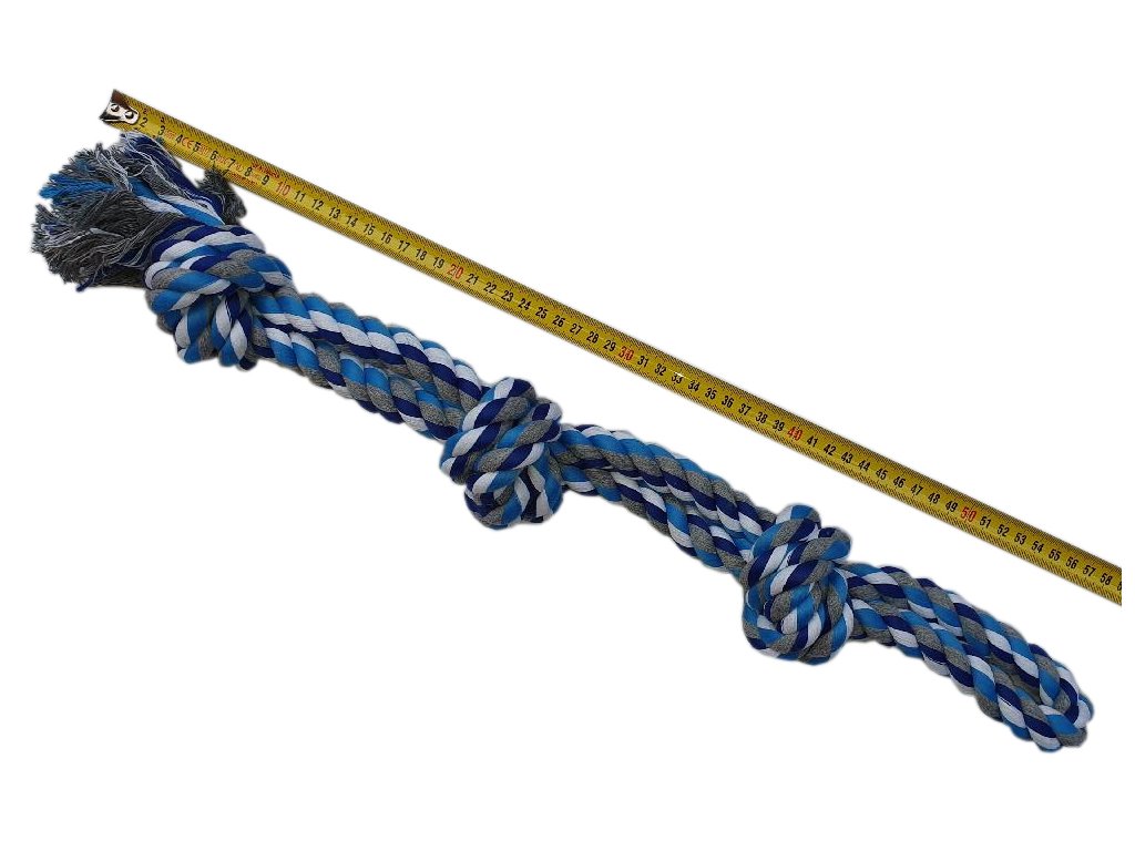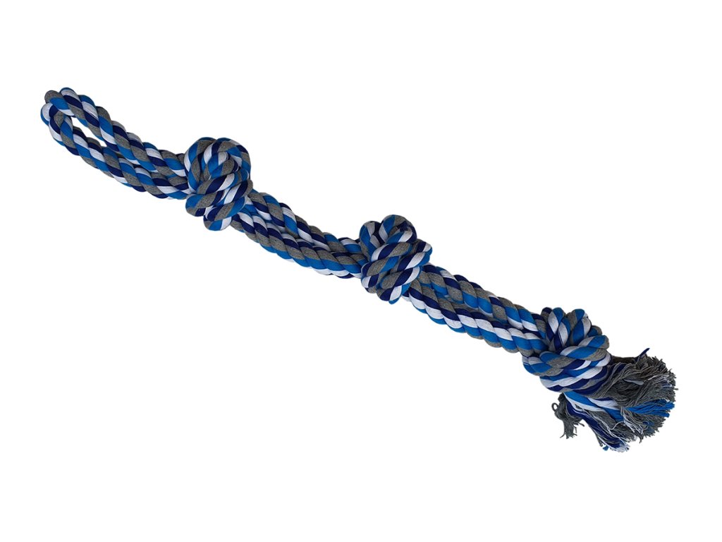 Bavlněný uzel modré barvy je výbornou hračkou pro psa s podporou dentální hygieny.