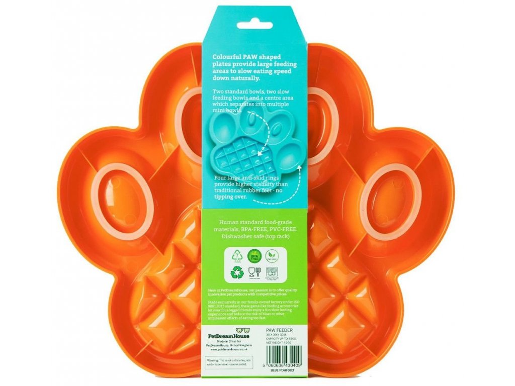 Miska Paw Slow Feeder obsahuje dvě standardní pole (85 ml x 2), dvě s výstupky (70 ml x 2) a jednu velkou plochu (190 ml) s protihltací mřížkou. Povrch misky je tak celkově mnohem větší než u běžných misek a jídlo tak může být rozděleno hned na několik porcí. Rozdělením krmiva do různých přihrádek s různými povrchy je pejsek přinucen ve své hostině zpomalit. Zároveň pro něj ale není nijak náročné jídlo najít.